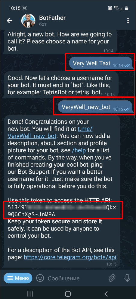 Теперь нам нужно дать имя боту, которое пользователи будут видеть при поиске и дальнейшем общении с ботом. Дальше нужно задать никнейм или адрес бота. Адрес должен быть уникальным, т.е не повторять существующие в базе, и заканчиваться обязательно на слово Bot. Если адрес не занят, а имя введено правильно, BotFather пришлет в ответ сообщение с токеном — «ключом» для доступа к созданному боту. Его нужно сохранить и никому не показывать.
