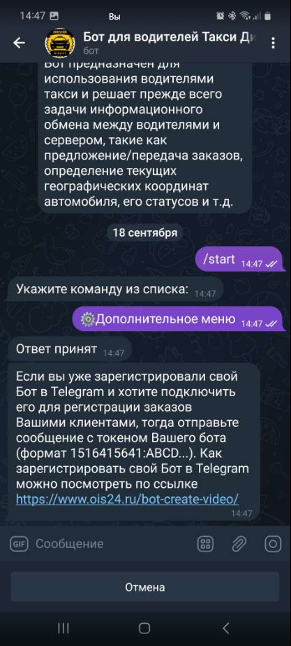 Отправьте сообщение боту с токеном вашего нового бота, и система подключит вам бота для клиентов автоматически. Заказы с этого бота будут приходить вам под 2%, а всем остальным водителям – под 8%, 6% из которых будет получать водитель-владелец, т.е. вы.